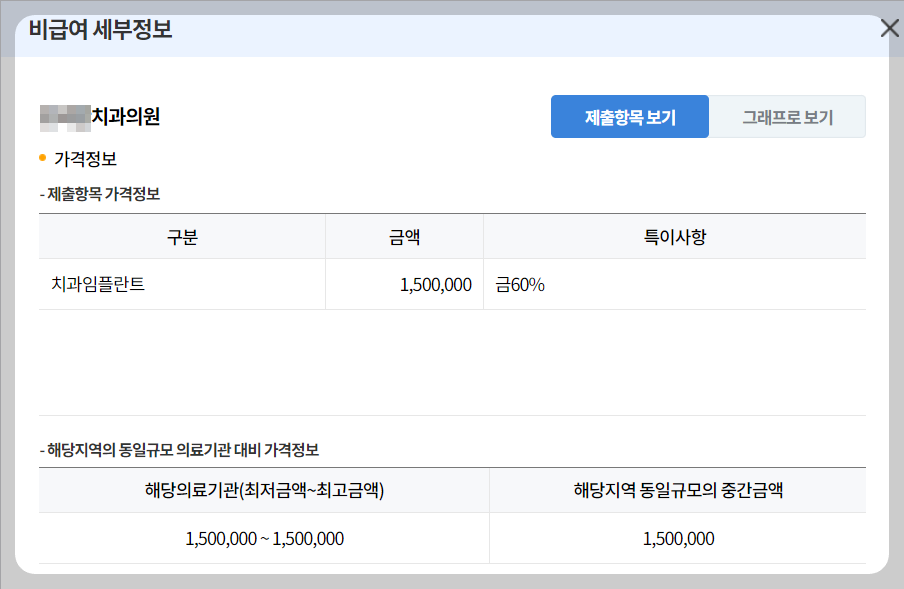 비급여 진료비용 공개 제도를 활용하여 해당 치과 병원에서 제출한 임플란트 가격 정보를 미리 확인해보시고 방문하시는 것이 혹시나 모를 가격, 비용 분쟁을 최소화하고 어느 정도 예산 책정을 할 수 있기 때문입니다. 아래와 같이 해당 병원별로 임플란트 가격이 모두 공개되어 있기 때문에 미리 알고 가시면 편리합니다.