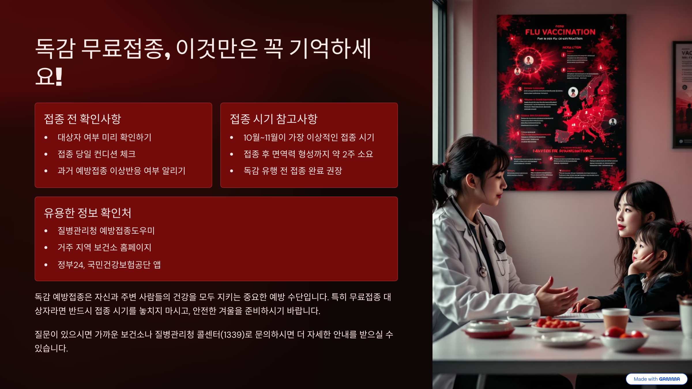 - 백신 접종 시기는 매년 10월 이전 완료 권장 (CDC 기준)